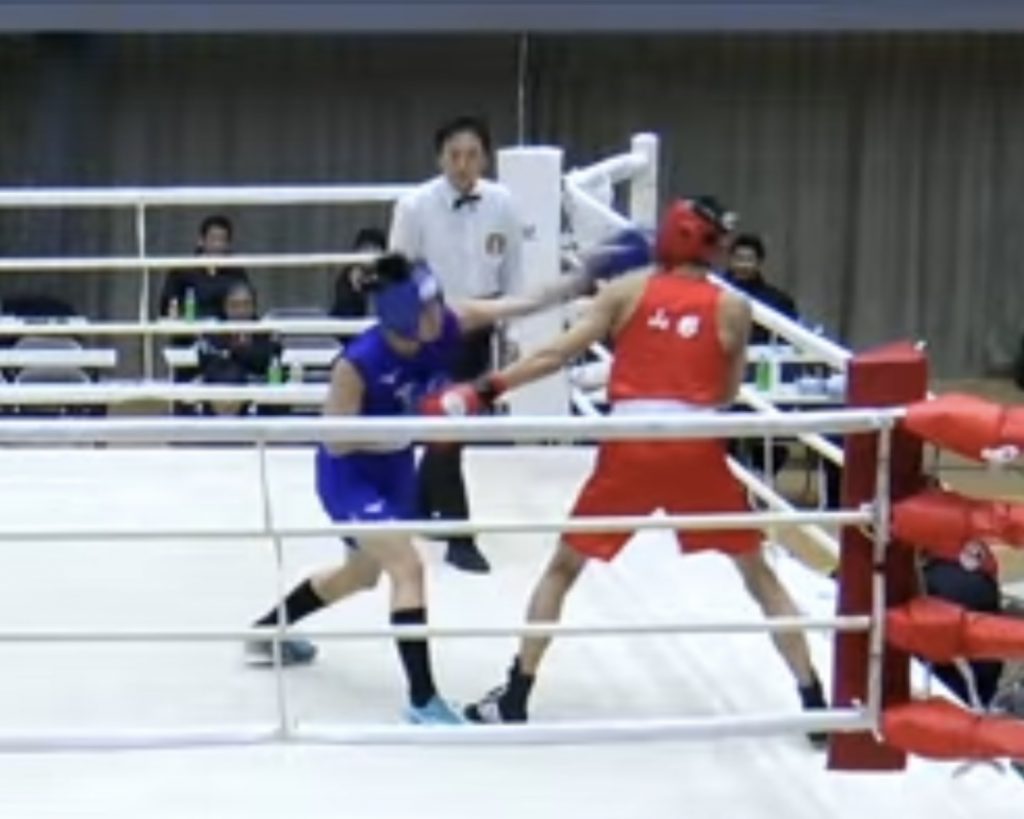 一瞬速く右がヒットした折原選手(赤)